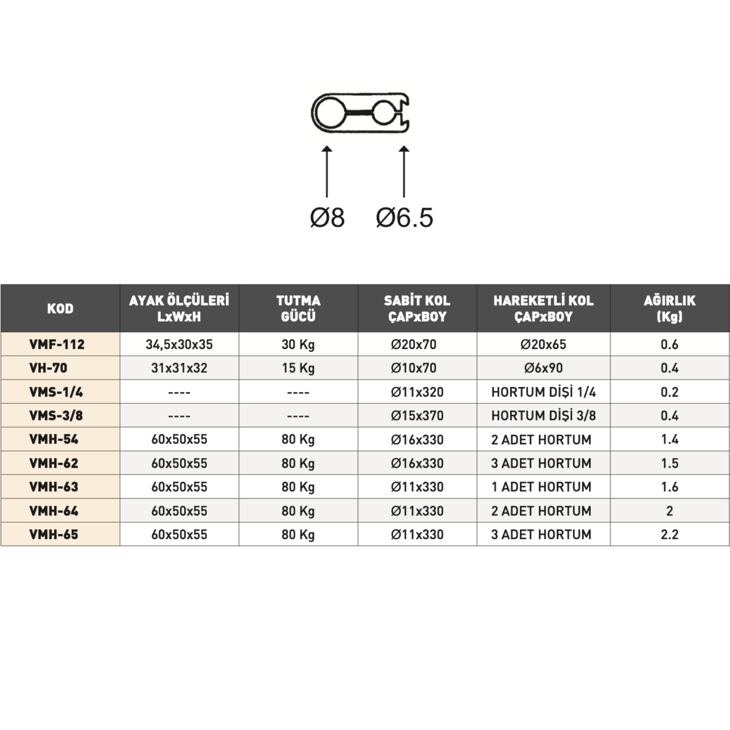 • Ayarlanabilir ve Hidrolik Kollu Modeller: VMB-70, VMB-106 ve VMB-106H modelleri; hassas konum ayarlamaları, uzun kol mesafesi ve yüksek denge sağlar.