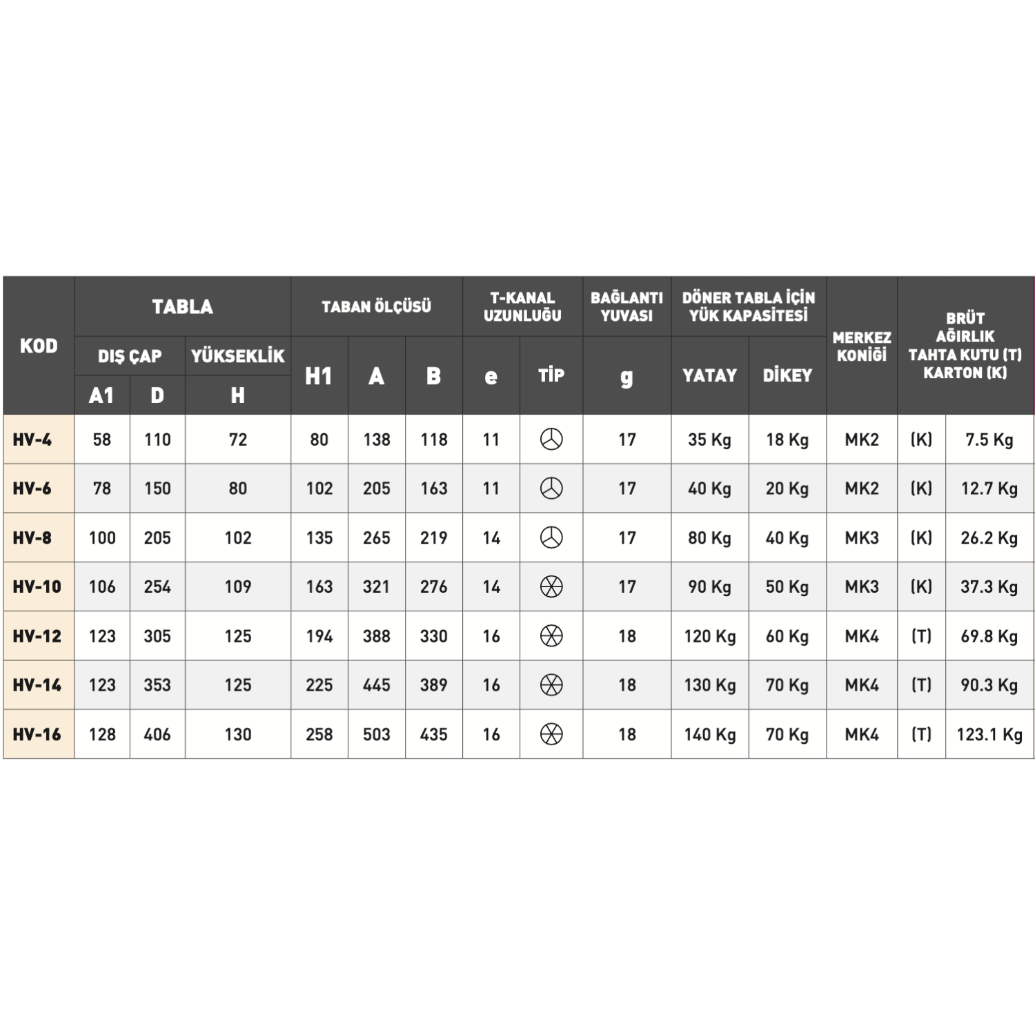 HV serisi tablalar hem yatay hem dikey konumda kullanılabilir. Bu sayede farklı açılarda delme, frezeleme, kanal açma ve ölçülü parçaların işlenmesi kolaylaşır. 360° dönebilme kabiliyeti, iş parçasının her yönden işlenmesine olanak tanır.